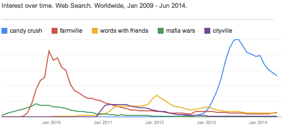 One of the critiques of King Digital is the need to diversify away from the amazing success of Candy Crush, which the falling share of total bookings would seem to indicate. However, one reason for this is that there were fewer Candy Crush bookings overall. And a Google Trends search seems to point to Candy Crush's quickly falling popularity, seemingly matching Zynga's (ZNGA +0.00%) FarmVille demise: