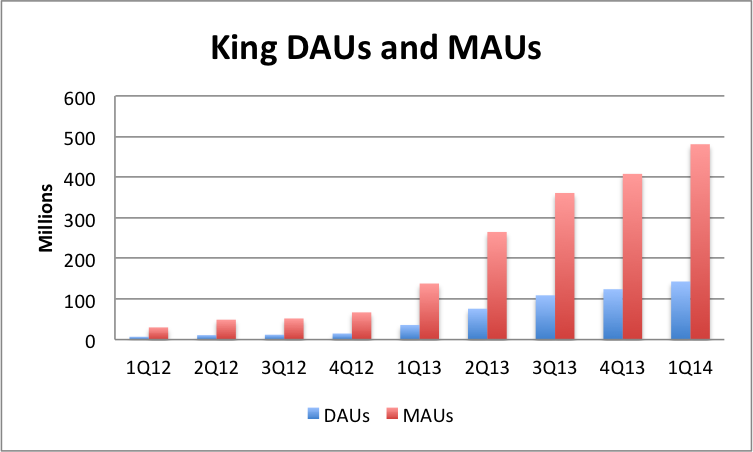 King revealed in its pre-IPO documents that Candy Crush accounted for 78% of total bookings, which created a dangerous dependency even in an industry known for dependency. Zynga, for example, tied 64% of its overall first-quarter online game revenue to three titles: Farmville 2, Zynga Poker, and Farmville. But King's situation improved in the first quarter.