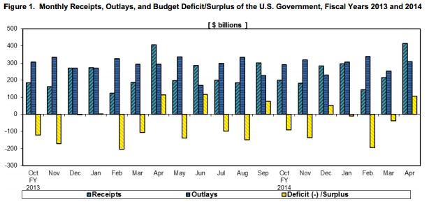 Overall April receipts (inflow) totaled $414 billion, while total outlays clocked in at $307 billion. The country is still running an overall deficit for the fiscal year.