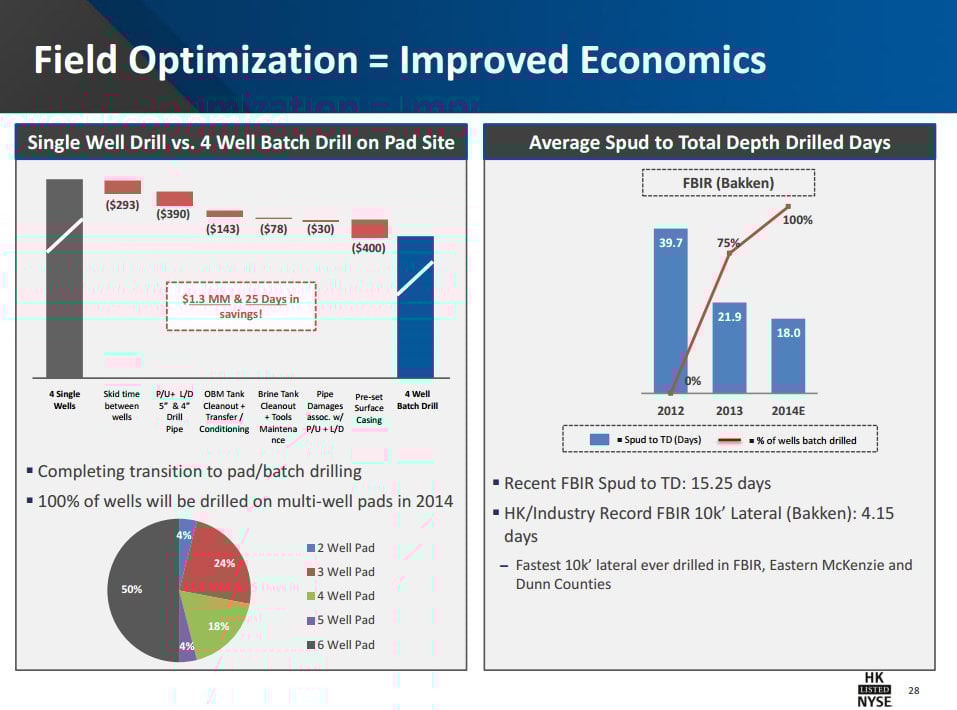 Looking ahead, Halcon Resources sees continued improvement in its well economics in the play. It's on pace to reduce its well costs by 5%-10% by the end of the year while also expecting to see continued strong initial production rates. As the following slide notes, Halcon Resources continues to optimize its drilling in order to improve its economic results.