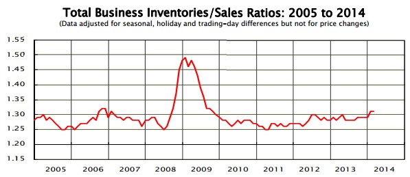 To understand the rate at which goods are being made and sold, economists compute an inventories/sales ratio. Since sales and inventories expanded relatively similar amounts from February to March, the inventories/sales ratio stayed steady at 1.30. The March 2013 ratio was 1.29.