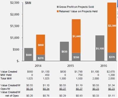 The company projects that it will create value of $1.11/watt by 2016, as compared to the current $0.20/watt (shown in the diagram.) The strategy of keeping more projects on the balance sheet (charging rent instead of one-time sales) will keep both the top and bottom lines under pressure. See the graph below for revenue and EPS trends.