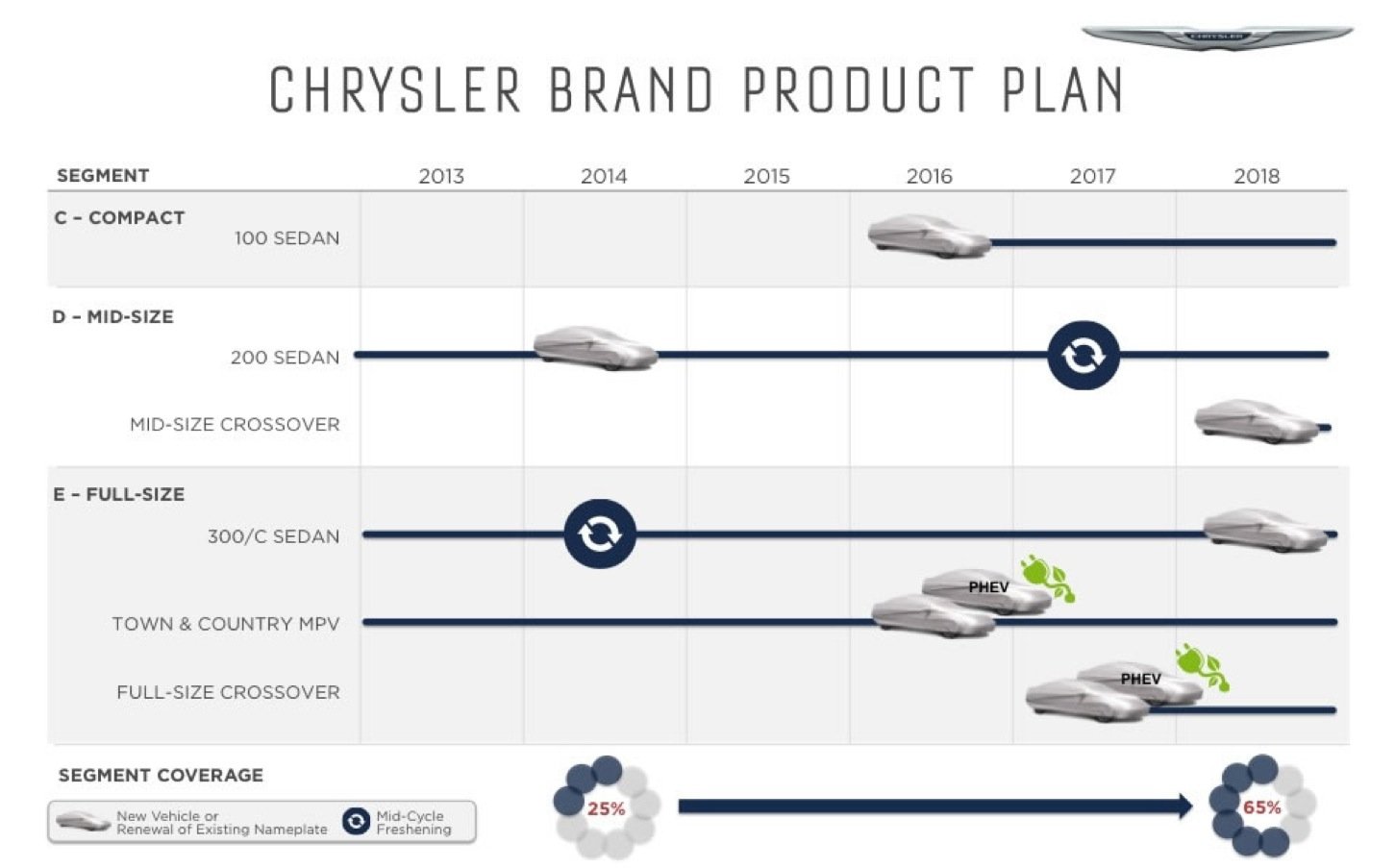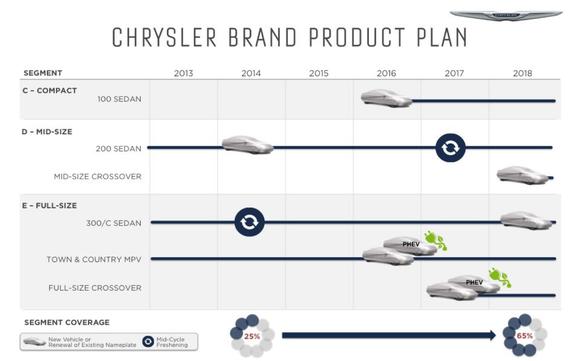 There are more new products coming for Chrysler beyond the 200 and the just-refreshed full-size 300 sedan. An all-new Town & Country minivan will arrive for 2016, along with a new small sedan, to be called the 100. Midsize and full-size crossover SUVs will follow. As you can see in the slide, FCA is planning both conventional and hybrid versions of the all-new Town & Country and full-sized crossover.
