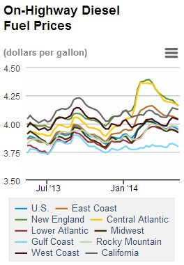 Diesel prices took a hint from gasoline, also falling $0.016 over the past week to $3.948 per gallon. This latest price tag puts diesel $0.082 per gallon above the same time last year. Every U.S. region saw diesel prices drop this past week. The Gulf Coast enjoyed the biggest dip ($0.016), while Rocky Mountain prices fell just $0.008.