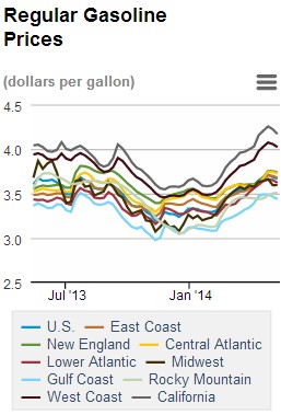 The national average price for regular gasoline clocked in at $3.668 per gallon on Monday, which was down $0.016 from a week ago but still $0.065 higher than the same time last year. West Coast gas prices dropped the most over the past week ($0.033), while Midwest prices barely budged, rising on average one-tenth of one penny.
