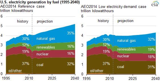 The U.S. Energy Information Administration (EIA) creates long-term forecasts for energy use in this country. Its "reference case" for electricity out to 2040 assumes that power generation is set to increase almost 30%, about 1% a year, to sate slowly increasing demand. That's basically what's happened for decades.