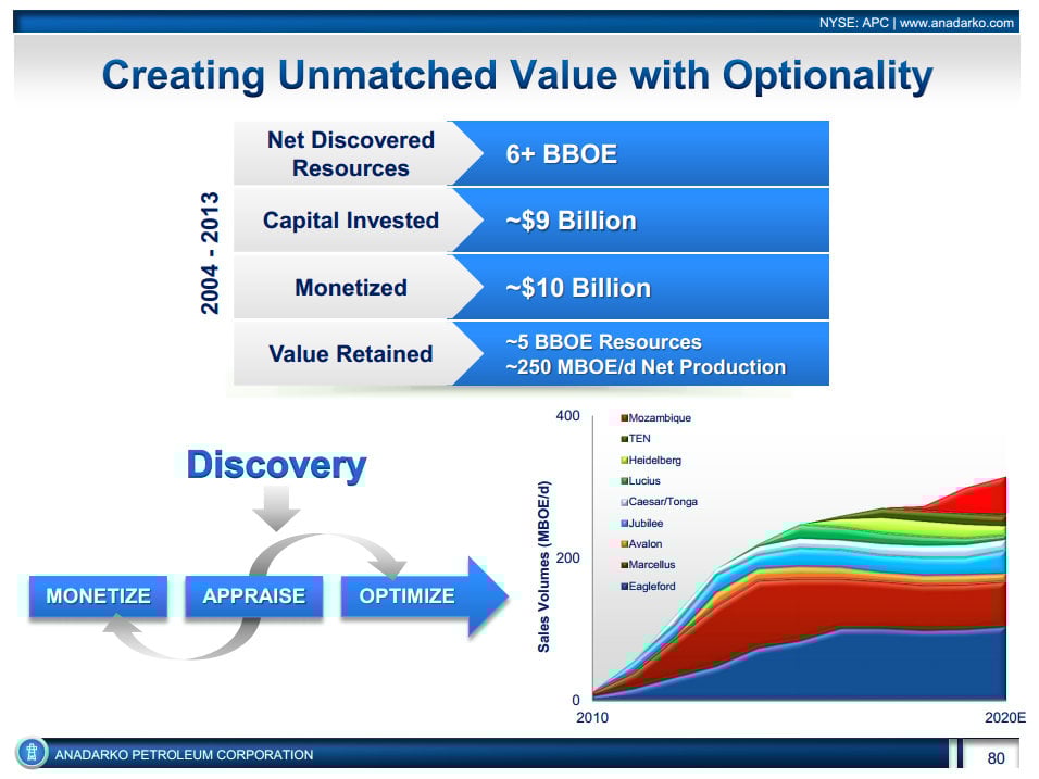 This model has been highly successful. As that slide noted, since 2004 the company spent $9 billion to discover more than 6 billion BOE. As part of its appraisal process, it decided to monetize about a billion BOE of those discoveries, netting the company around $10 billion. Because of that, Anadarko Petroleum ended up with an extra billion dollars in its pockets to go with 5 billion BOE of resources to be developed. That's a pretty exceptional value creation, which is why Lawler wants to see that model repeated at Chesapeake Energy.