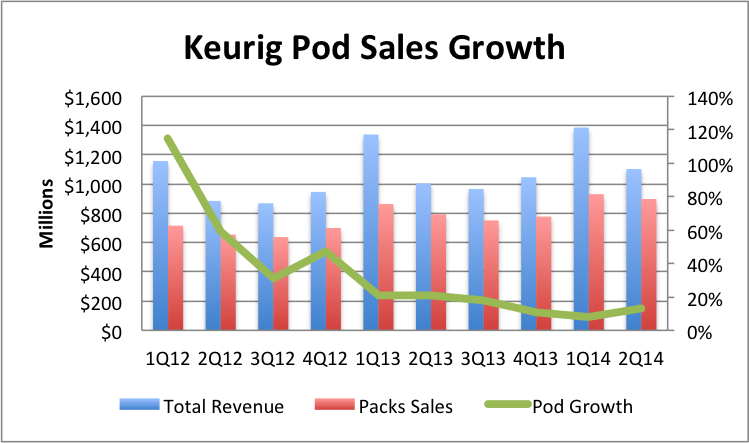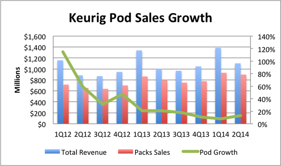 I mentioned in the second-quarter preview that most of Keurig's business comes from the sale of K-Cups, or pods, and changes in this segment give the quickest view of the company's current health. Segment sales have declined since the pods fell off-patent in late-2012 as lower-cost alternatives came to market. But Keurig has plans to keep that loss from continuing.