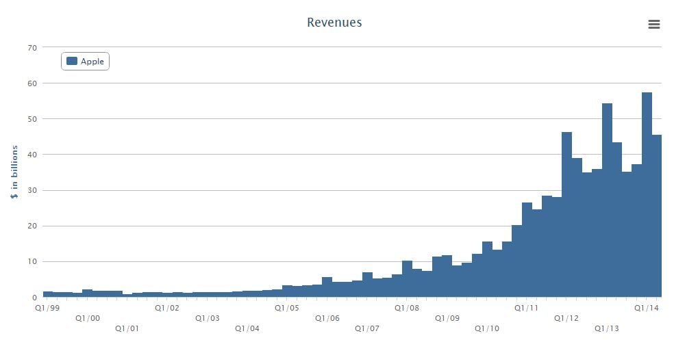 Not only do I disagree with the premise that Apple will see negative revenue growth any time soon, iPhone and iPad sales in China via China Mobile (CHL +0.00%), China's largest carrier, will continue to provide positive revenue growth for Apple for years to come. In fact, take a look at a couple of graphs that have been updated since Apple's recent earnings report. The first chart shows Apple's quarterly revenue since 1999: