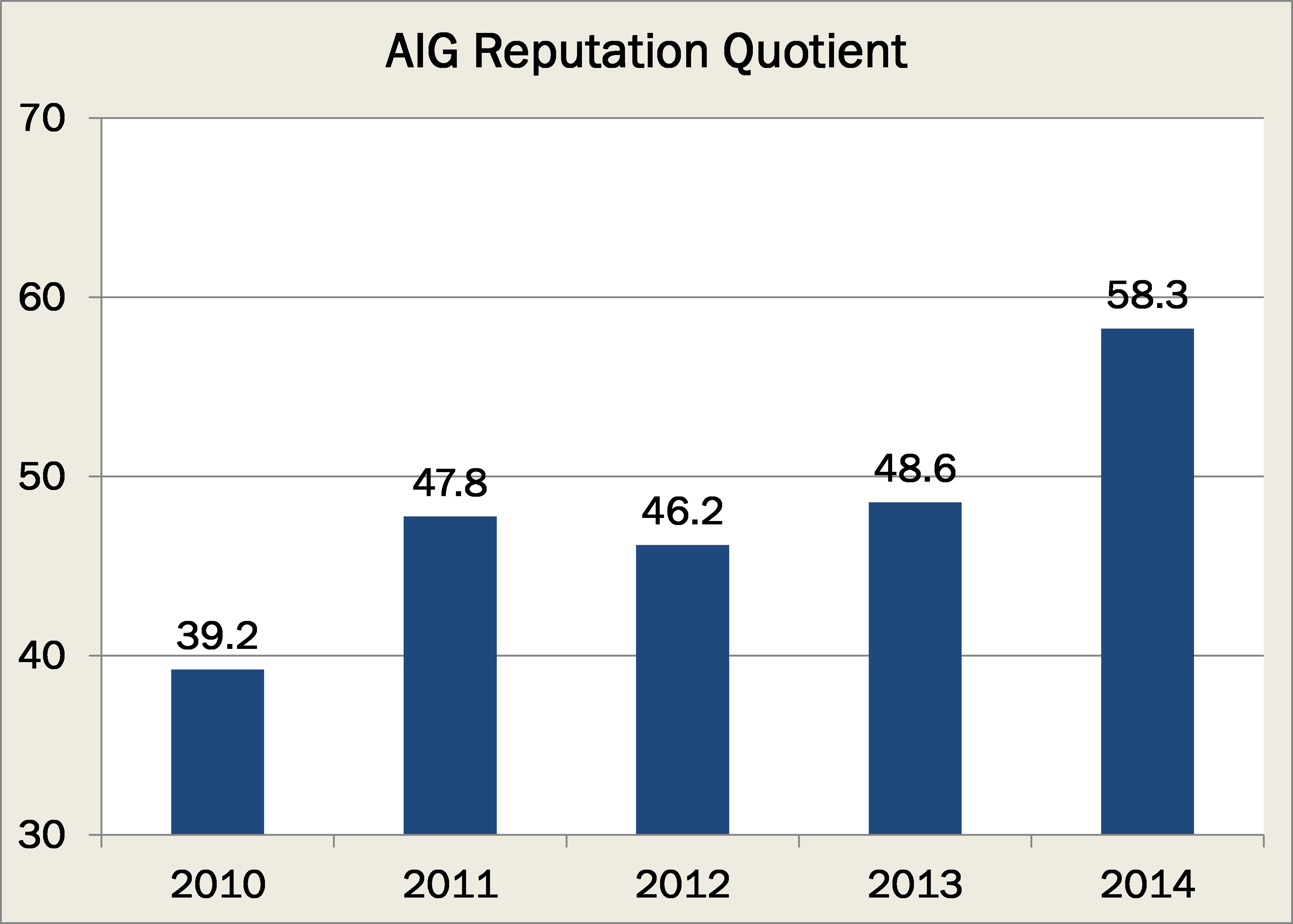 But the true picture is the history of AIG's reputation. As you can see, 2014 marked true growth from the reputational side of things for the company that received -- and returned -- more than $180 billion in government bailouts: