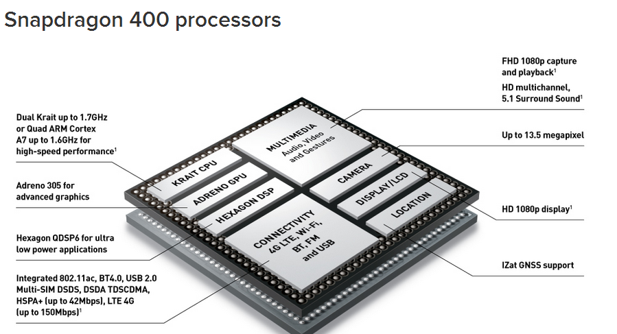 The low-cost, LTE-capable phone from ASUS will sport a low-end Qualcomm Snapdragon 400. This chipset has proven exceptionally popular and has powered everything from Samsung's Galaxy S4 Mini to hordes of white-box smartphones in Asia. It is not a particularly zippy chip, sporting four low-end ARM (ARMH +0.00%) Cortex A7 cores, but it is highly integrated and comes with a Qualcomm LTE modem as well as 802.11ac connectivity built right onto the processor.