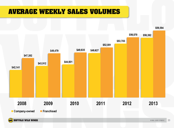 For its most recent quarter, Buffalo Wild Wings brought some great results. Top-line growth of almost 21% resulted in a 71% boost to earnings and same-store sales in both company-owned stores and franchised stores look healthy.