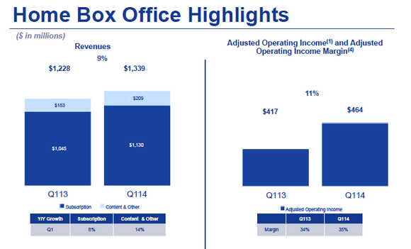 HBO (Home Box Office) increased revnues and operating incomes YoY, and with other works in pipeline, looks to be a continuing area of excitement for the company. Source: TWC earnings presentation