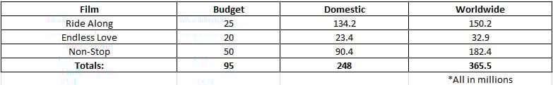 The following month Universal turned to teenagers and the Valentine's Day romantic drama Endless Love. While not a monster hit, the movie looks to have broken even and served as a nice bridge to Liam Neeson's thriller in the air, Non-Stop, which powered its way to over $175 in worldwide ticket sales.