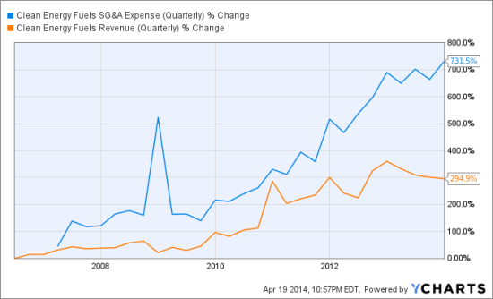 Clean Energy Fuels is facing the troubling trend of general administrative expenses as a percentage of revenues climbing over the last six years (to 45% of adjusted revenue).