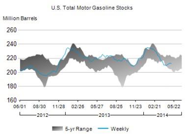 Gasoline inventories declined 0.8 million barrels (0.4%) after expanding 1.6 million barrels the week before. Demand for motor gasoline over the last four-week period is up a seasonally adjusted 3.2%. In the last year, supplies have contracted 2.4%.