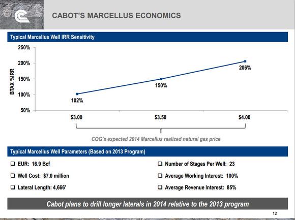 As Enerplus is now seeing, high rate natural gas wells in the Marcellus can really move the needle. Companies like Cabot Oil & Gas (COG +1.11%) have found that the best spots in the Marcellus can deliver rates of returns in the triple digits as the following slide notes.