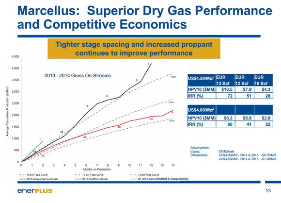 While Cabot Oil & Gas found one of the best drilling locations in America, that's not stopping it from working to improve its already great well results. As that slide notes the company is planning to drill longer laterals in 2014, which could yield more upside to each well. That upside potential could follow Enerplus as its well completions continue to evolve.
