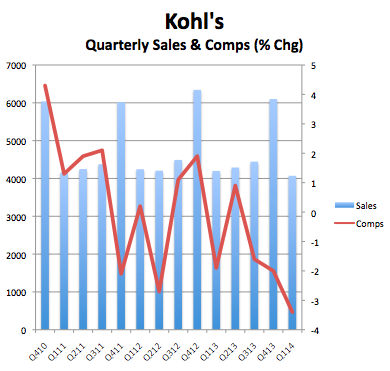 I noted earlier today that Kohl's executive suite is in the midst of turmoil at the moment. That along with a tougher competitive environment with Macy's on one side and Wal-Mart and Target on the other, and a resurgent Penney's itself targeting the same demographic, suggests that the tough times it's facing will be more challenging than the supposed weather impacts it endured in the first quarter.
