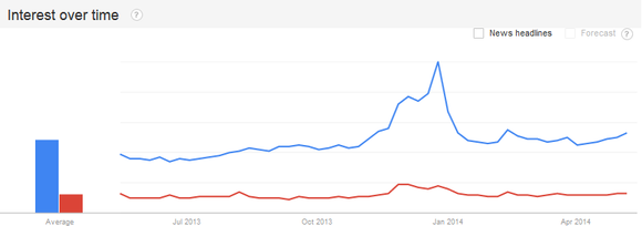 The chart is normalized so all values are compared to its highest point, which Michael Kors held in around January of 2014. The uptrend in Michael Kors searches around that time most likely resulted from the popularity of Kors during the holiday season, which resulted in its stellar earnings and revenue for that period. It can also be deduced from the chart that Kate Spade has been relatively flat and did not realize a significant uptick in search volume during the holidays. It's apparent that Michael Kors is more popular not just on Facebook and Twitter but on Google as well.