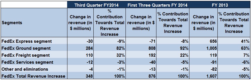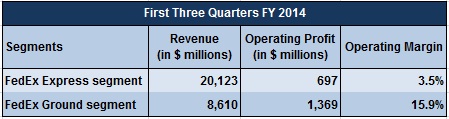 While the size of the Express business is about two and a half times the Ground business in terms of revenue, the latter has generated double the profits of the former in the first three quarters. In fiscal 2013, return on invested capital in the Ground segment was a mind-boggling 18%. Management has said that FedEx Ground's profit margins are the best in the industry.This shows that the growing proportion of Ground segment sales is improving the company's overall profitability.