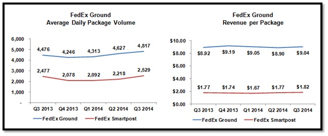 The good thing about the Ground segment is that all its services -- FedEx Ground, FedEx SmartPost, and FedEx Home Delivery -- are in demand. The third quarter benefited from market share gains in the home delivery business, which in turn led to an 8% increase in average daily package volume. Yield, which is revenue per package, also increased on account of the January rate hike of 4.9%. Consolidated segment sales improved 10% over last year to cross $3 billion.
