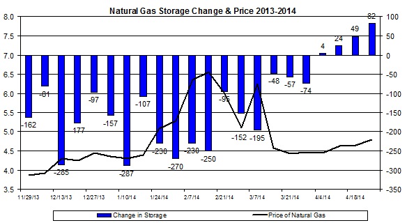 The chart below shows the change in natural gas storage and the price of natural gas in recent months.