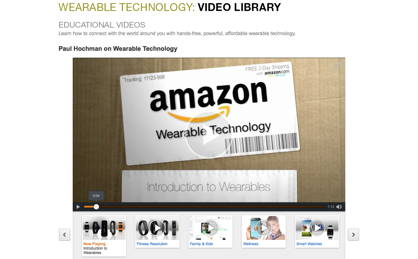 Product reviews have long been the domain of services like Consumer Reports, websites such as cnet.com, and an array of magazines. While the independence of these sources will continue to attract customers, Amazon.com is constantly expanding its content of informational videos and other content to help educate consumers. Within the wearable computing store, Amazon.com has already released videos educating customers on the options available and how they can help with fitness, health, and other applications.