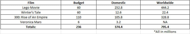 But it wasn't just Lego for Warner Brothers. In the first quarter, it also released 300: Rise of an Empire and Veronica Mars. Rise of an Empire earned over $328 million worldwide, impressive given that the sequel didn't have the same stars as the original and the concept was harder to develop given 300's finite ending.