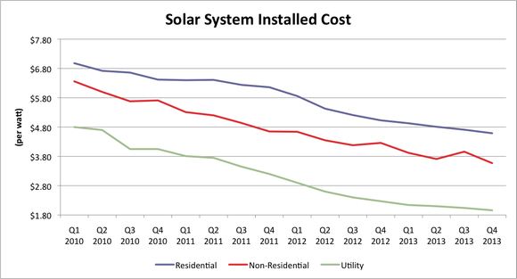 What's recently changed about solar is that it's cost competitive with the grid and that's now how it's being sold to consumers. SolarCity (SCTY +0.00%) is leading the charge in residential solar, offering consumers lower costs by putting solar panels on their roofs for $0 down and saving them money on their electricity costs. As costs have fallen, new financing programs have opened up like leases and loans that make solar accessible for millions of Americans. SolarCity is planning to install 1 million solar systems itself by 2018, an incredible feat that's driven by economics, not environmental concerns.