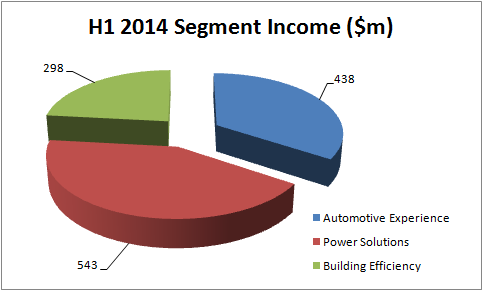 The company reports results within three separate segments, and a look at its segmental income for the first half reveals how it makes money. For ease of reference, its power solutions business is a leading supplier of automotive batteries, automotive experience sells automotive finishing (seating, interiors, etc.), and building efficiency sells heating, ventilation, and air conditioning, or HVAC, solutions.