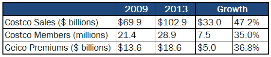Like GEICO, Costco has also experienced rapid growth. Since 2009, Costco sales have risen nearly 50%, from $70 billion to more than $100 billion, and its membership base has grown 35%, from 21.4 million to 28.9 million.