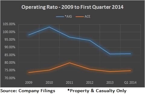 ACE has consistently shown strong underwriting compared to its peers. This looks especially true stacked next to AIG.
