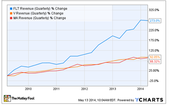 Looking ahead, FleetCor is expected to continue outgrowing MasterCard and Visa too. According to Yahoo! Finance, on average analysts expect FleetCor to grow revenue 21.5% and EPS 24.2% in 2014. These estimates compare favorably to MasterCard's respective projections of 12.1% and 15.7% and Visa's 8.3% and 18.4%.