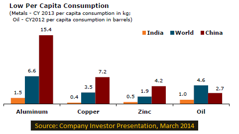 India's per capita consumption of commodities is significantly low as compared to the world and China.
