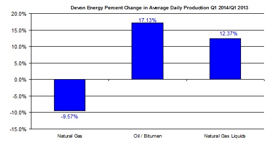 On a yearly scale, the company plans to increase its annual oil production by nearly 27% compared to 2013. Moreover, its natural gas production is expected to tumble by nearly 19% during 2014. To that end, Devon Energy acquired 82,000 net acres in the Eagle Ford. This acquisition will augment Devon Energy's oil production in the coming quarters. Case in point: In the first quarter of 2014, the company managed to increase its oil production by more than 55% in the U.S. -- mostly due to Eagle Ford output. Keep in mind, however, that the Eagle Ford's March output (alone) was added to the first-quarter results. Therefore, the company is likely to show higher oil production in the coming quarters.