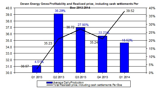 The company's decision to shift toward oil production, along with the steady rise in the company's gross profitability, resulted in more than 18% gross profitability in the first quarter of 2014 -- nearly 14 percentage points higher than in the first quarter of 2013. The rise in the average realized price per barrel of oil equivalent has also improved Devon Energy's profit margin. The chart below shows the changes in its gross profitability and realized price of oil equivalent barrel in recent quarters.