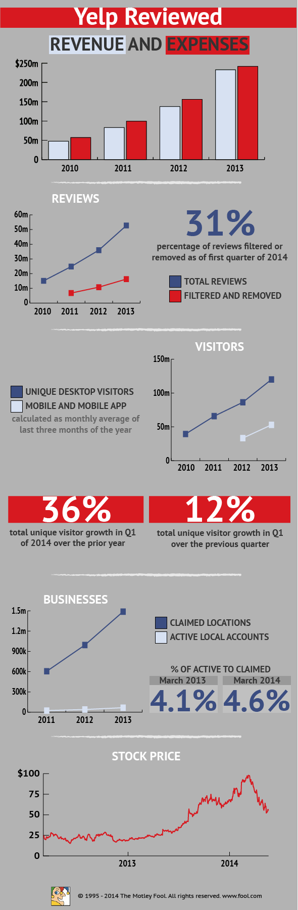 Even if it's just a case of businesses taking up a fight with Yelp rather than the displeased customers, it's unlikely Yelp will be able to completely clear its name. But as a positive sign for the company, the proportion of businesses buying advertising has risen to 4.6% out of the total businesses that have been "claimed" by the business owners. This is up from 4.1% last year.