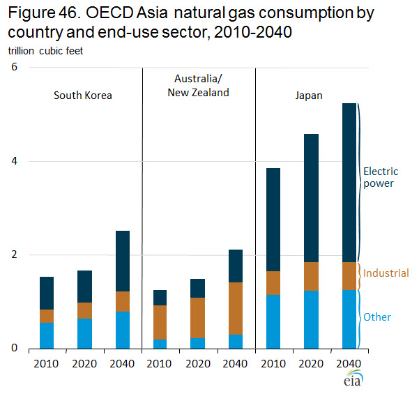 Europe is not the only region of the world that is likely to demand more natural gas going forward. Asia will also see higher demand. According to the U.S. Energy Information Administration, the consumption of natural gas in Asia's OECD-member nations is expected to increase by an average of 1.3% per year from 2010-2040. This will increase this region's consumption of natural gas from its current level of 6.7 trillion cubic feet per year to 9.9 trillion cubic feet per year.