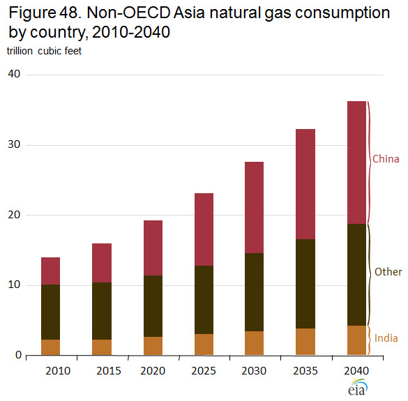 However, this growth will be dwarfed by the growth in demand from those Asian countries that are not members of the OECD. The EIA expects natural gas demand in these countries to grow at an average of 3.3% annually over the 2010 to 2040 period. This will increase the region's consumption from its current level of 13.9 trillion cubic feet to 36.3 trillion cubic feet.