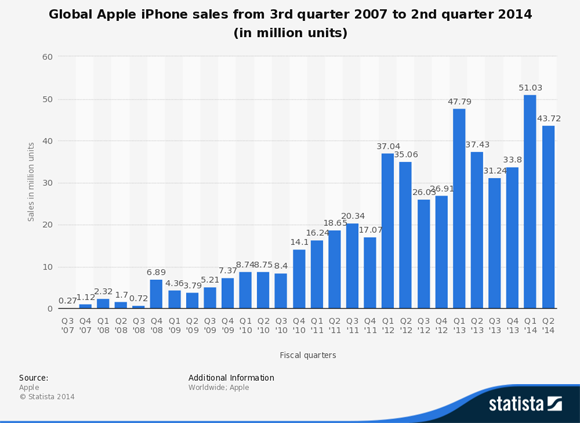 There are few things to point out from this data. The first being that the Apple's iPhone debuted in September of last year, while its top competitor, the Samsung Galaxy S5, came to market in April of this year. That's clearly going to hurt some of the iPhone demand considering that Samsung makes great devices that are comparable to the iPhone, and even better in some aspects.