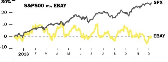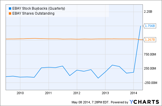 eBay has been using part of its $9 billion in repatriated cash to finance the buybacks. The company chose to take a hefty $3 billion charge from the taxman to bring the money back home, instead of taking the Apple route and issuing bonds to finance its buyback program. Substantial share buybacks usually produce a positive effect on a company's shares, as seen below: