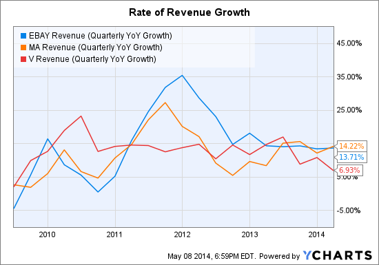 Last year, PayPal's growth bested that of the two leading card payment companies, MasterCard and Visa. But, the slower growth of eBay's merchandise segment placed the company's overall growth somewhere between MasterCard on the higher side and Visa on the lower side.
