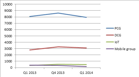 The company posted revenue of $12.8 billion in Q1 2014, as compared to $13.8 billion in the previous quarter. This translates to a decline of 8%, sequentially, and a growth of 1.4% on a year-over-year basis. The decline, compared to the previous quarter, may be due to seasonal effects, as the revenue shows growth when compared to prior year. The PC and datacenter groups were the primary revenue-generating segments for the company, as usual. The main reason for the meager growth was the fact that the 4.8% growth in data-center revenue was partially offset by the decline in PC group revenue. The 61% decline in the mobile segment, despite Intel's efforts in that space, is alarming.