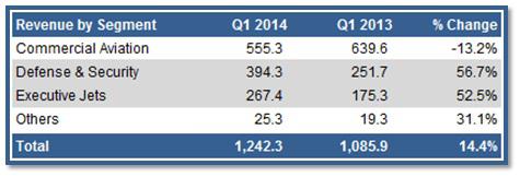 Embraer's sales outlook for the full year remains unchanged at $6 billion to $6.5 billion. While, the Brazilian jet maker expects the proportion of defense and executive segments in total revenue to increase in 2014, the welcome news for investors is that orders for E-Jets have also picked up.
