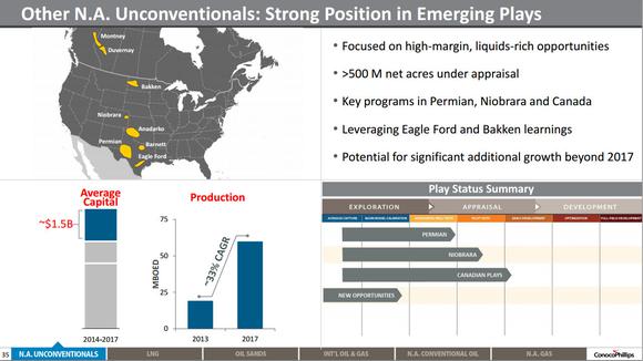 ConocoPhillips' growth is currently being fueled by unconventional shale plays like the Eagle Ford and Bakken Shale plays. But the company sees new shale plays emerging, which are a key to fueling its next phase of growth. Specifically it sees the Permian Basin and Niobrara plays in the U.S. and the Montney and Duvernay plays in Canada providing growth potential beyond 2017 as we see in the following slide.