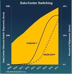 Crehan Research predicts that the data center switch market will reach $16 billion by 2017. According to the report, ethernet and fiber channel over ethernet, or FCoE, will become an ever-increasing portion of the market. IDC predicts continued growth for fiber channel port and revenue over the next four years. 16G FC is expected to grow at a CAGR of 52% (2011-2016). Crehan projects a 40% CAGR for Gen 5 16G fiber channel until 2016. To summarize, the need for data will drive the growth of infrastructure products, and fiber channel is expected to be the fastest-growing segment.