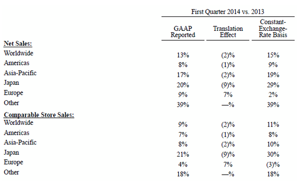 Another growth driver for the company was its dedication to opening new locations. While comparable store sales globally grew 9% for the quarter, it was the 6% jump in store count from 275 stores last year to 292 this year that carried its revenue the rest of the way.