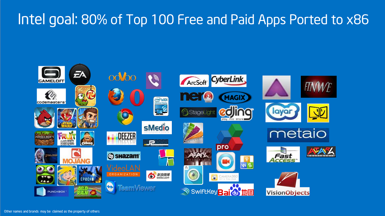 First, Intel is working diligently to get 80% of the top 100 free and paid applications ported to X86. Given Intel's willingness to push into the tablet/mobile markets, there's little doubt that the company will hit this goal sooner rather than later.