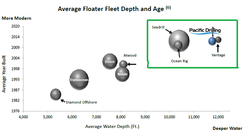 Let's compare Vantage Drilling to its closest peers, Pacific Drilling (PACD +0.00%) and Ocean Rig (ORIG +0.00%). The peers have been chosen on the basis of their fleet age and capability.